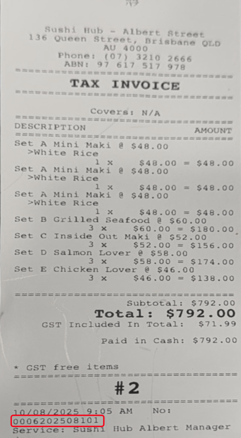 Receipt number is found after the date